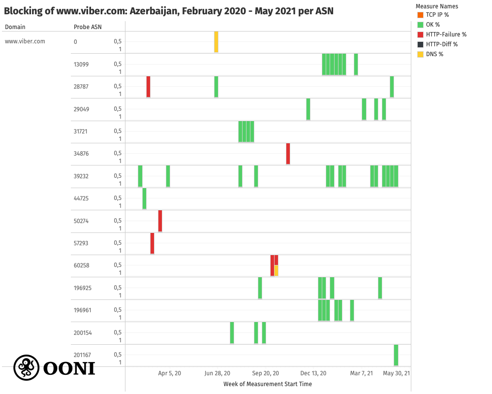 Chart: Testing of www.viber.com across AS networks in Azerbaijan between February 2020 to May 2021 based on OONI data, https://explorer.ooni.org/search?since=2021-05-11&domain=www.viber.com&probe_cc=AZ