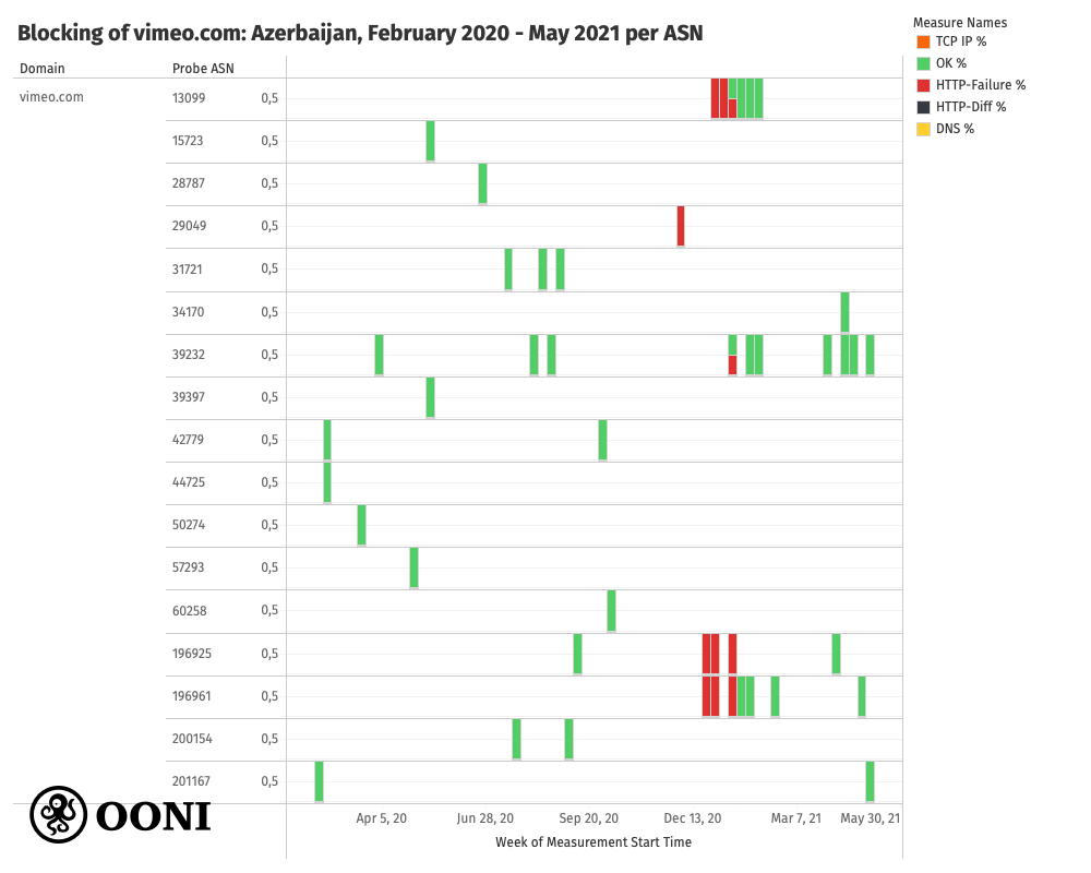 This is suggested from OONI measurements which show that connections to https://vimeo.com timed out when performing the HTTPS request to the site every time that it was tested throughout this period. This is further suggested by the fact that we observe the exact same HTTP failures and timeouts (on 5 AS networks) as we did for the testing of other websites (discussed previously). The following chart provides a per-ASN breakdown of vimeo.com measurement coverage in Azerbaijan between February 2020 to May 2021.