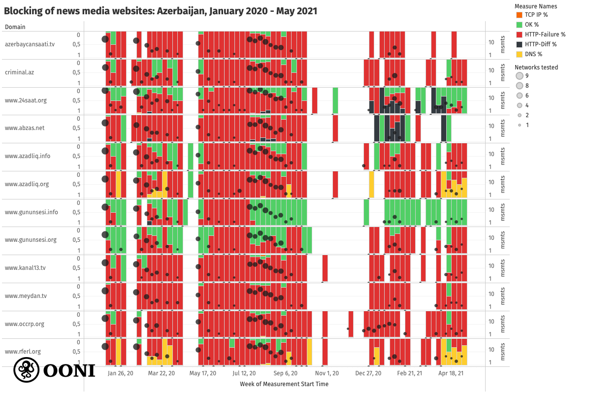 The following chart illustrates OONI measurement findings from the testing of these media websites (on multiple local networks) in Azerbaijan between January 2020 to May 2021.