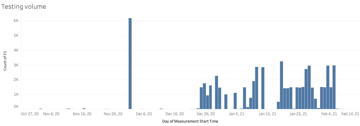 But starting from 24th December 2020, OONI Probe testing coverage in Azerbaijan increased significantly. The following chart illustrates that most domains from the testing lists were tested at least once between December 2020 to February 2021, while in many cases, around 1,400 domains were tested per day in Azerbaijan.