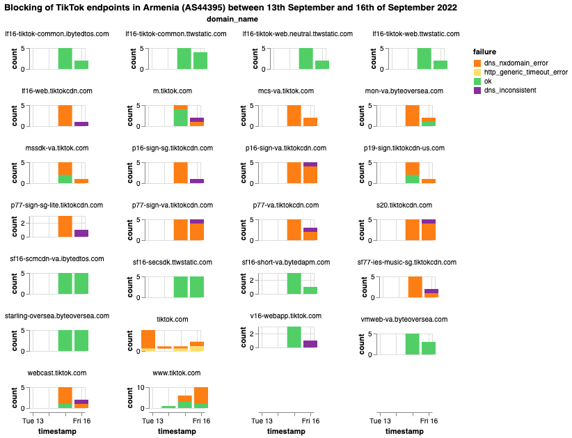 OONI data shows the blocking of TikTok in Armenia on 13th September 2022. Out of the 5 networks from which TikTok measurements were collected, we are able to establish that the blocking began on 2 of them on 13th September 2022. Specifically: