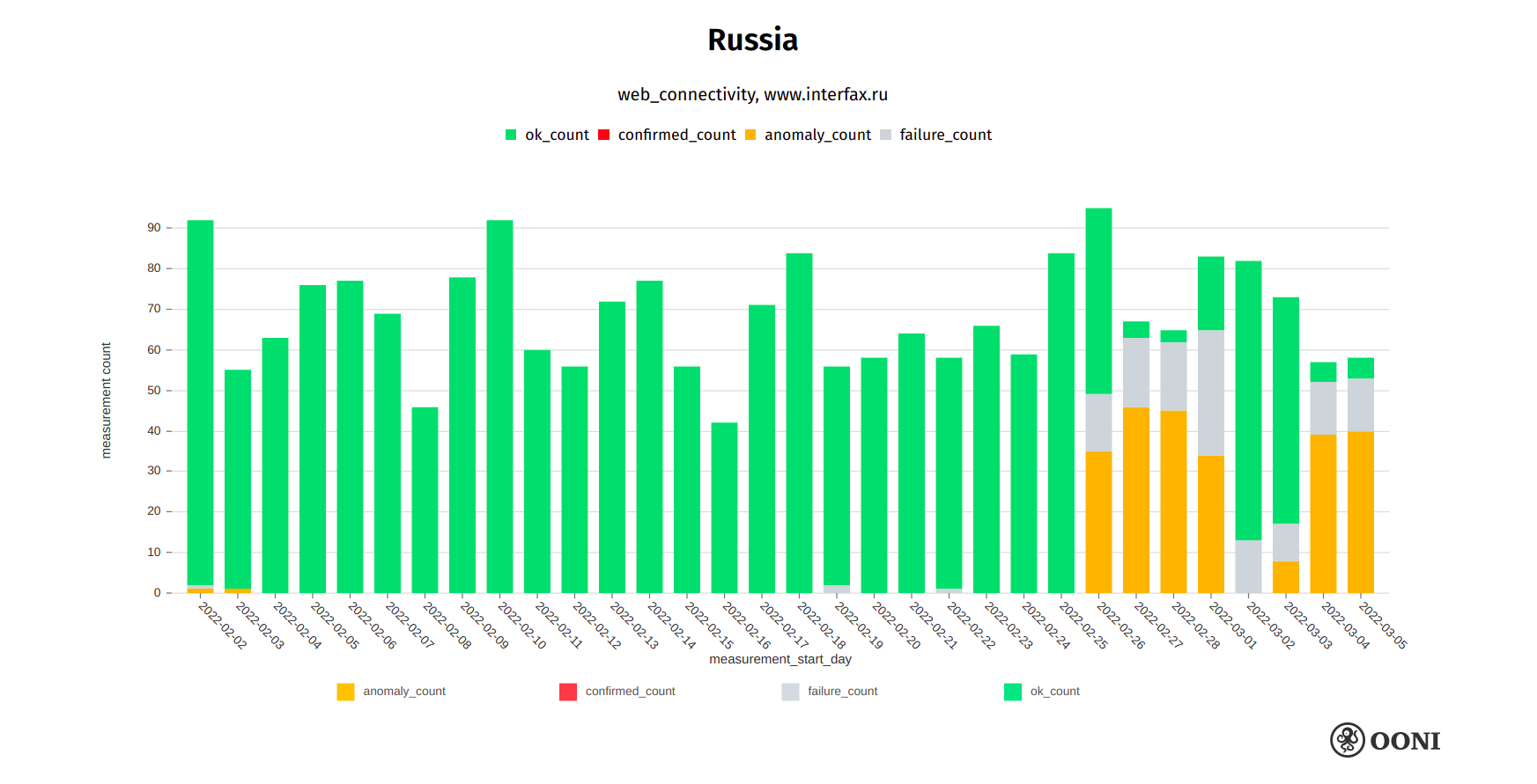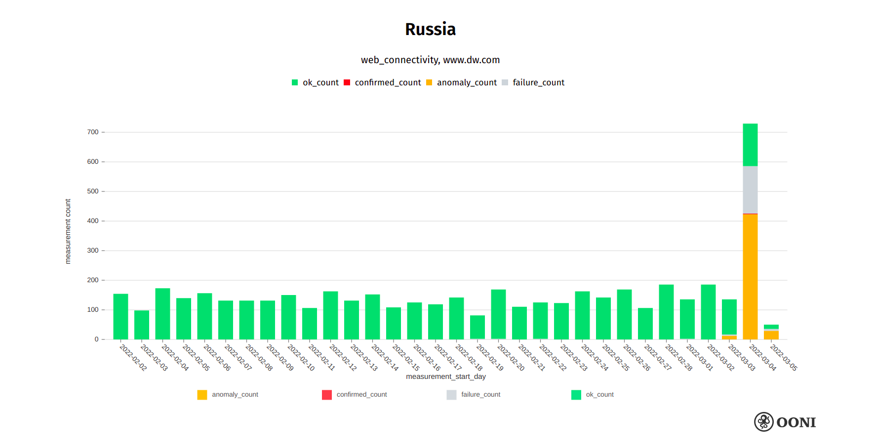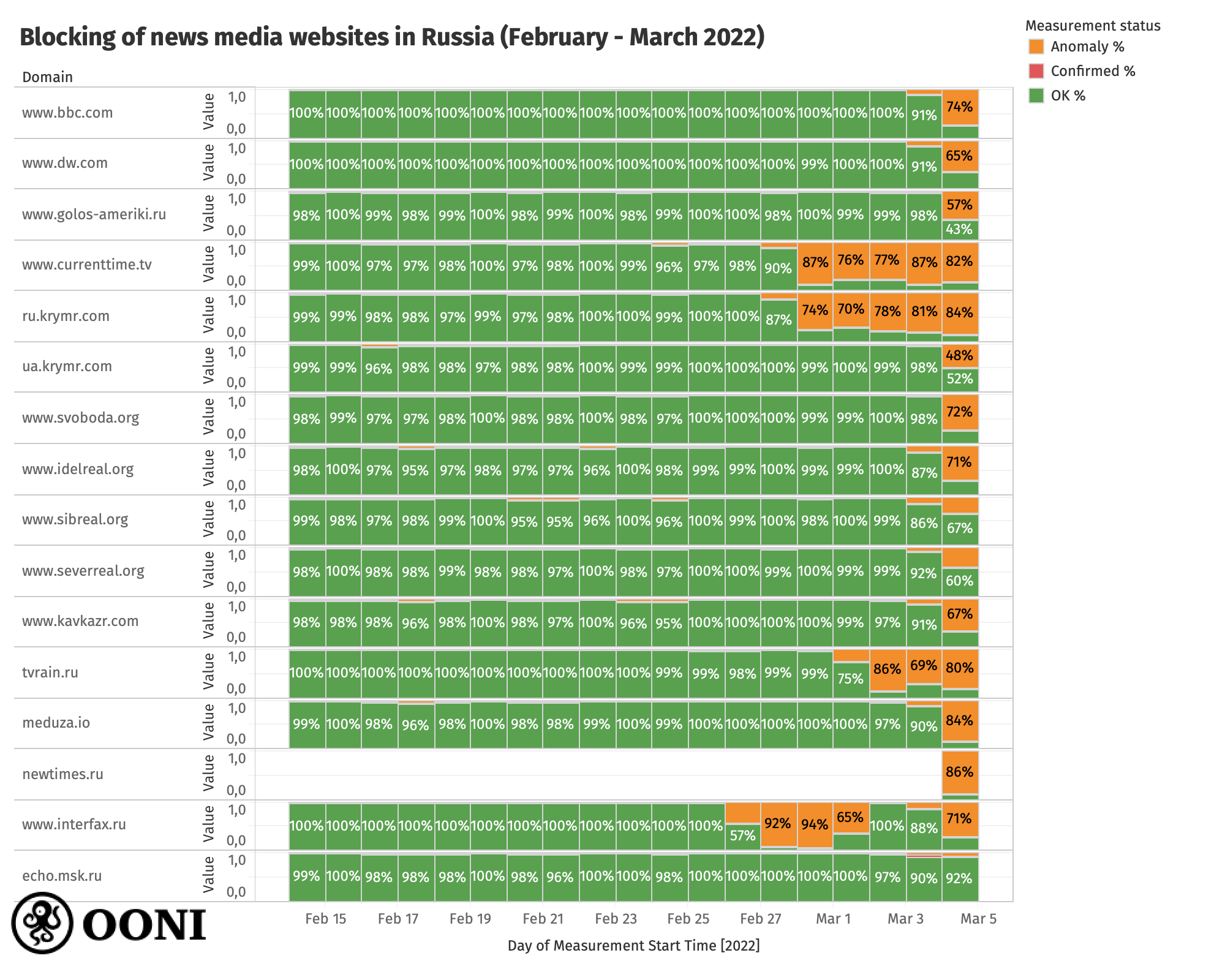 We are able to observe the blocking of media websites in Russia through OONI data, as illustrated in the chart below.
