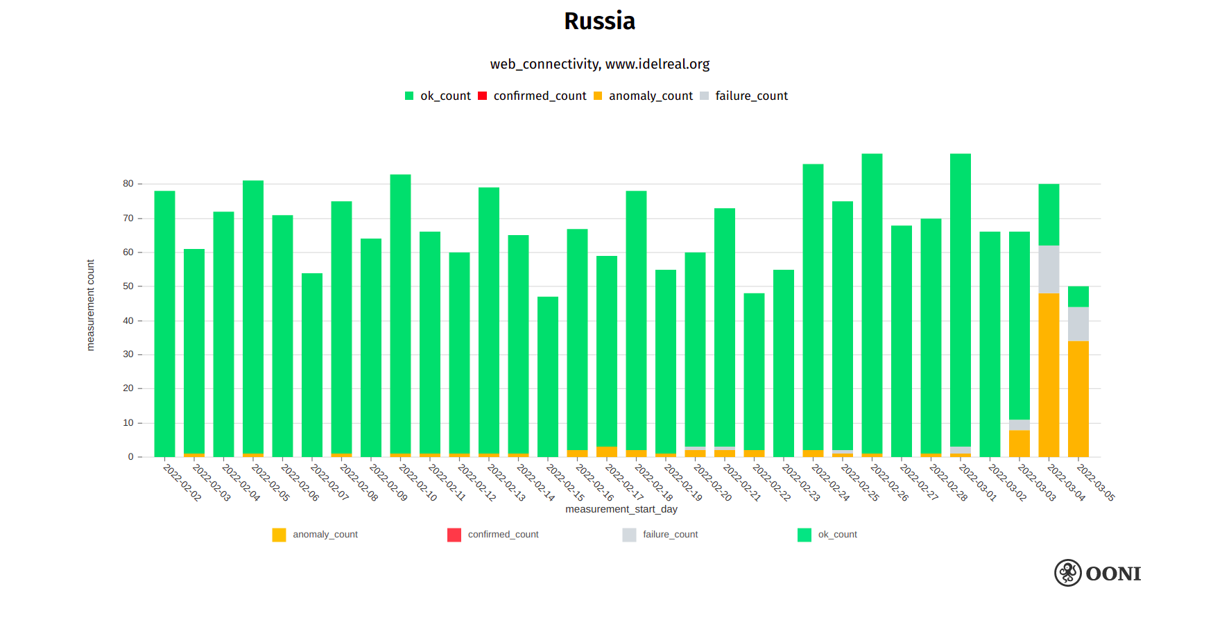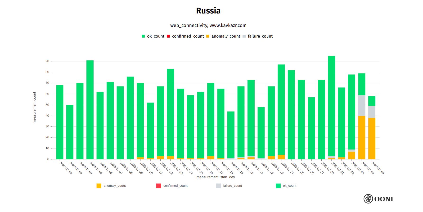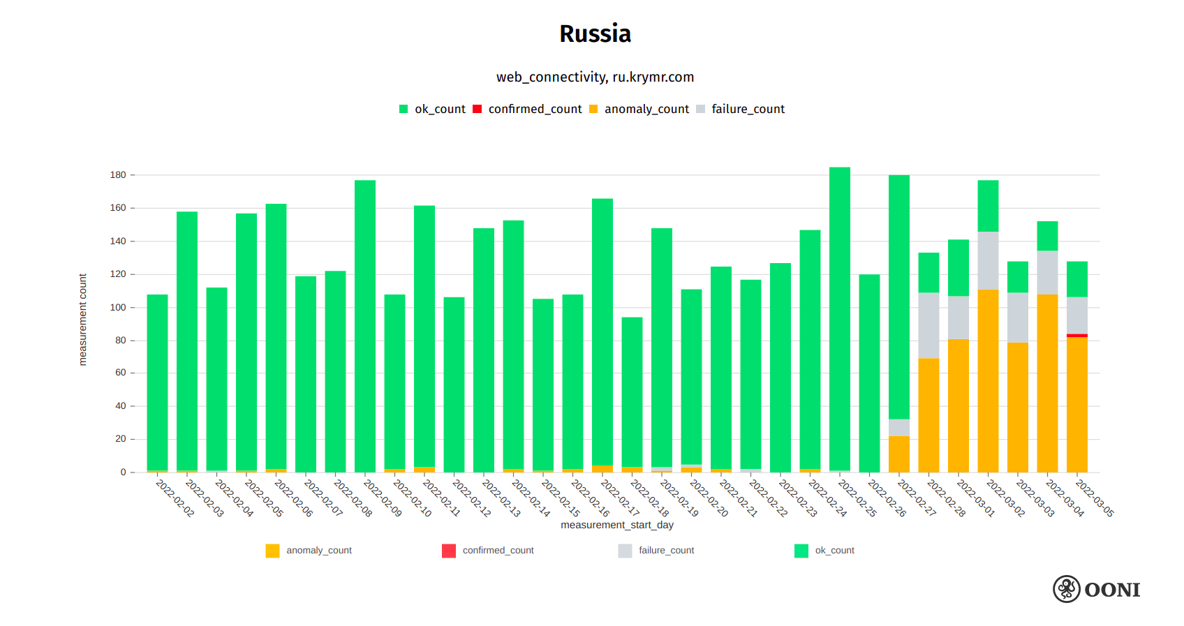 We are able to observe the blocking of media websites in Russia through OONI data, as illustrated in the chart below.