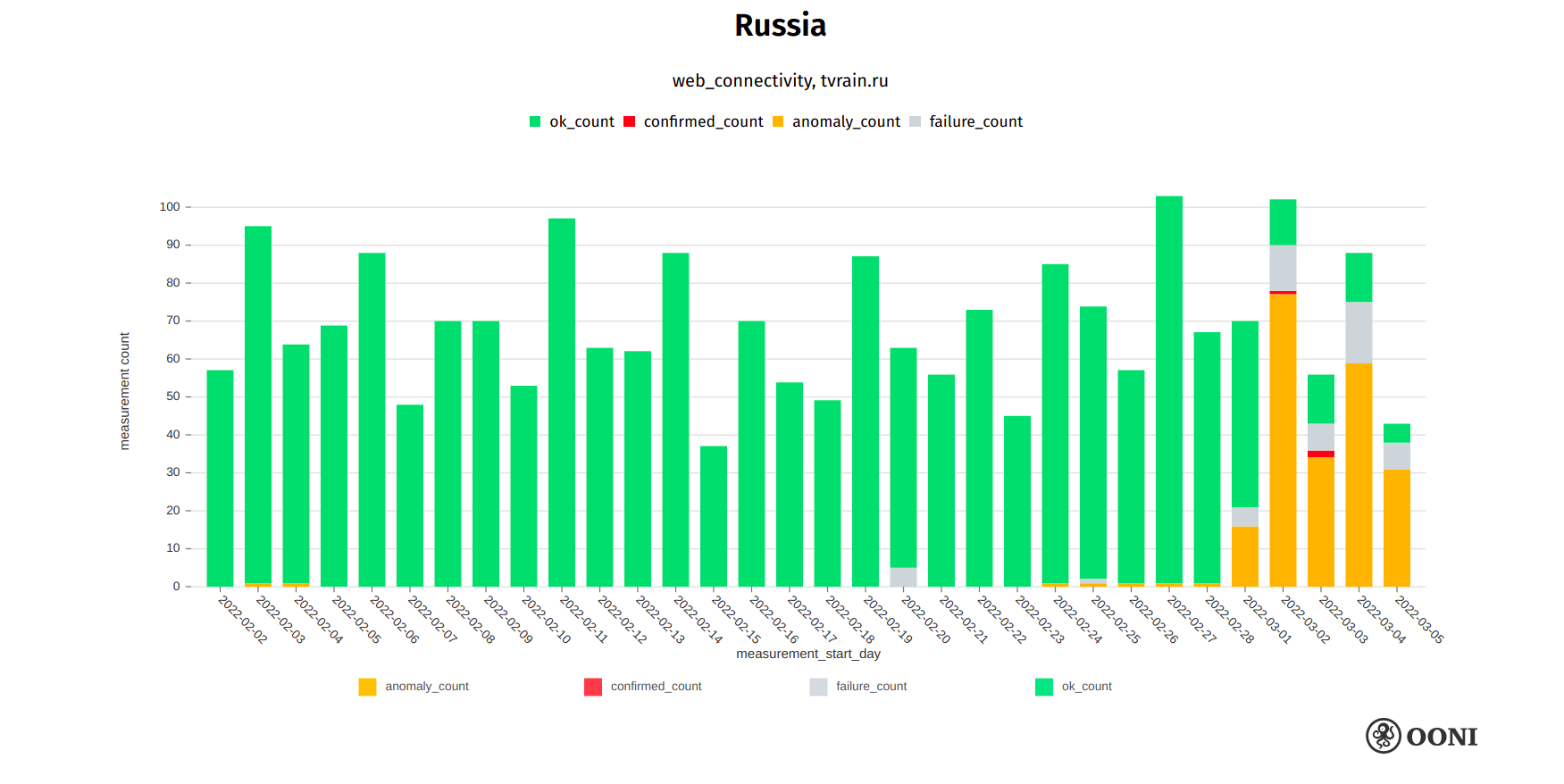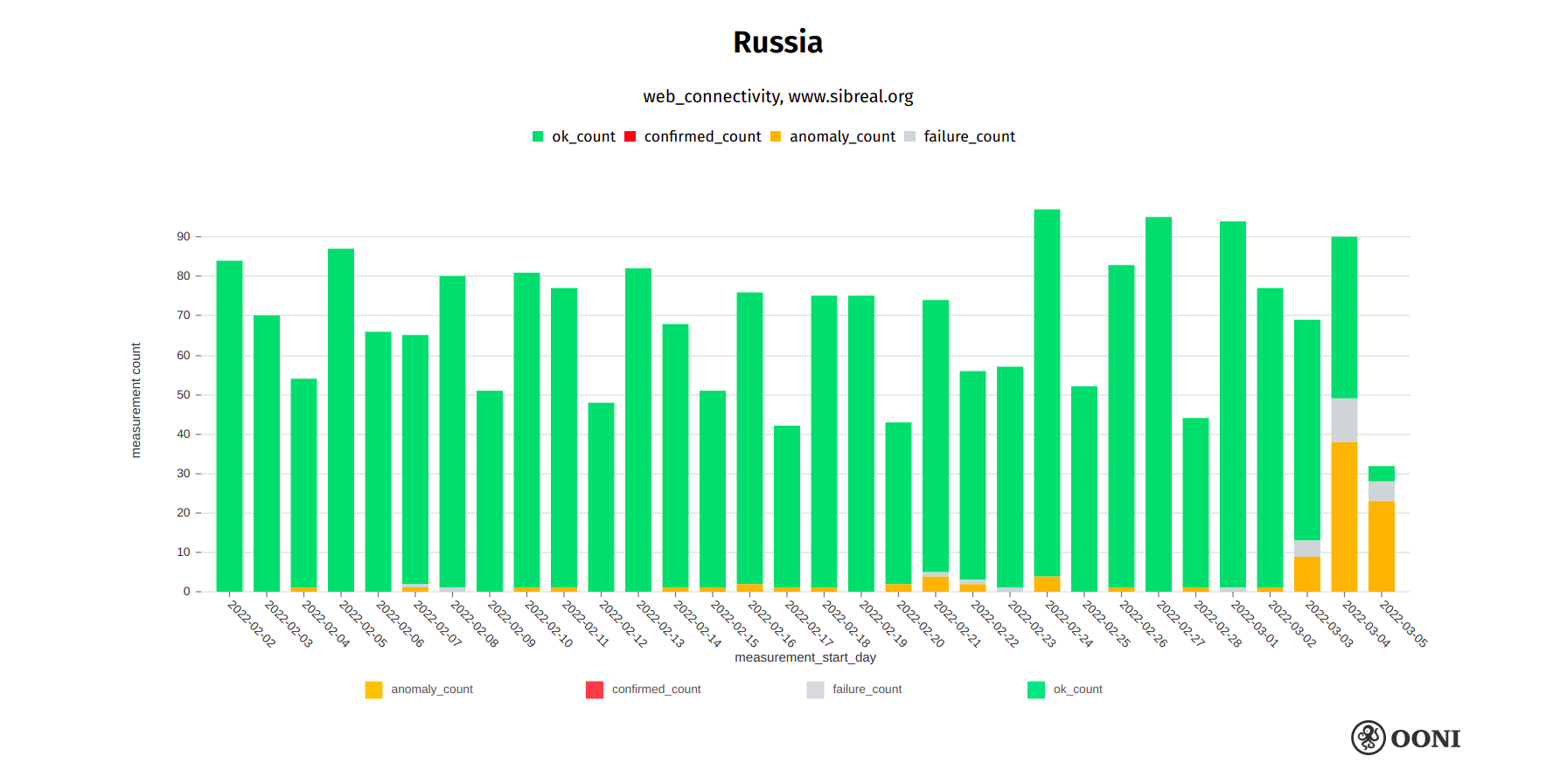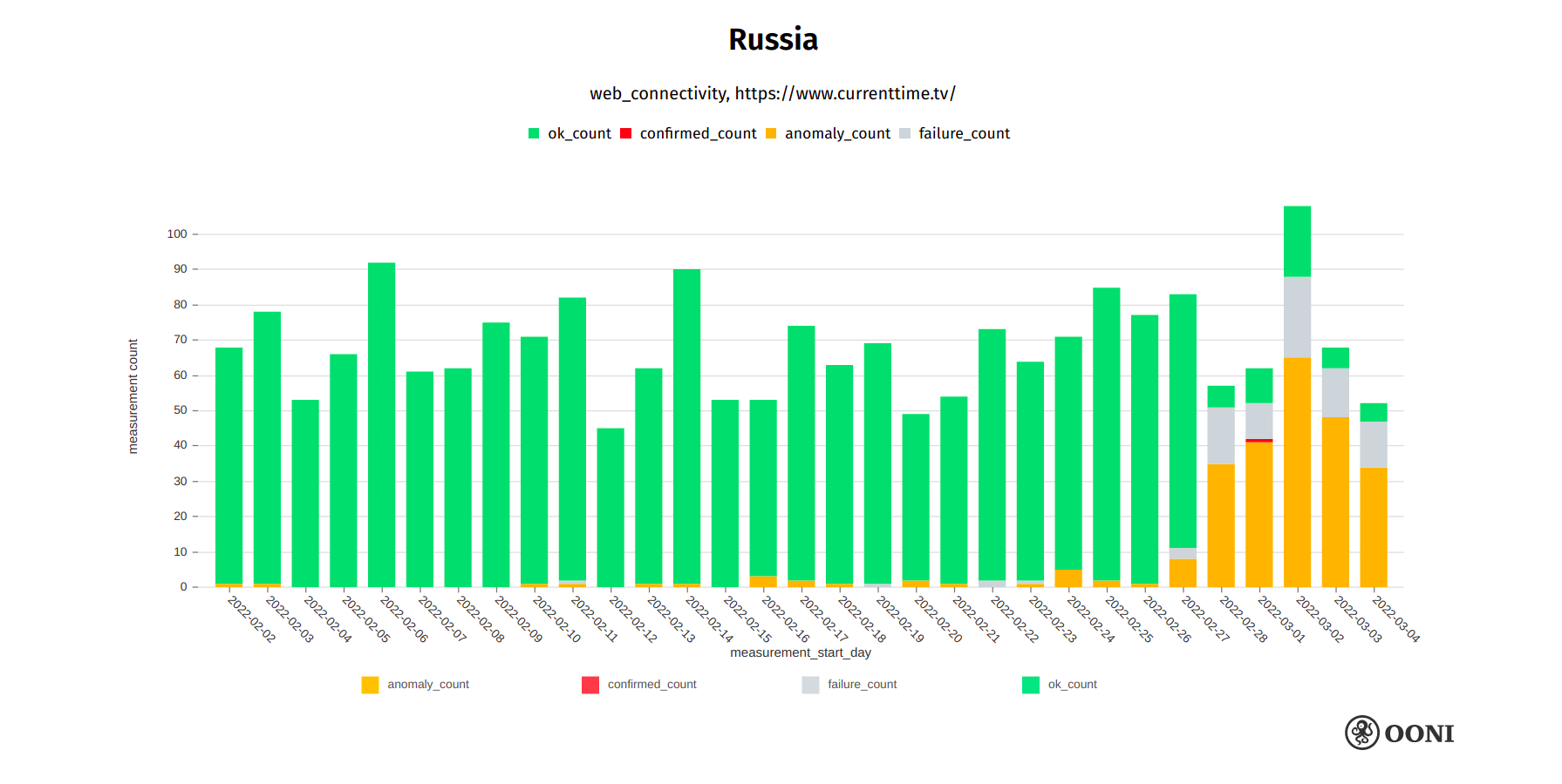 - Centralized throttling of Twitter. OONI data suggests that access to twitter.com was throttled in Russia between 26th February 2022 to 4th March 2022. As the throttling of twitter.com seems to have stopped across all ISPs in Russia at the same time (~08:00 on 4th March 2022 UTC), it appears to have been centralized. Moreover, interference to twitter.com appears to have changed from throttling to blocking (through the injection of a RST packet) on 4th March 2022.
