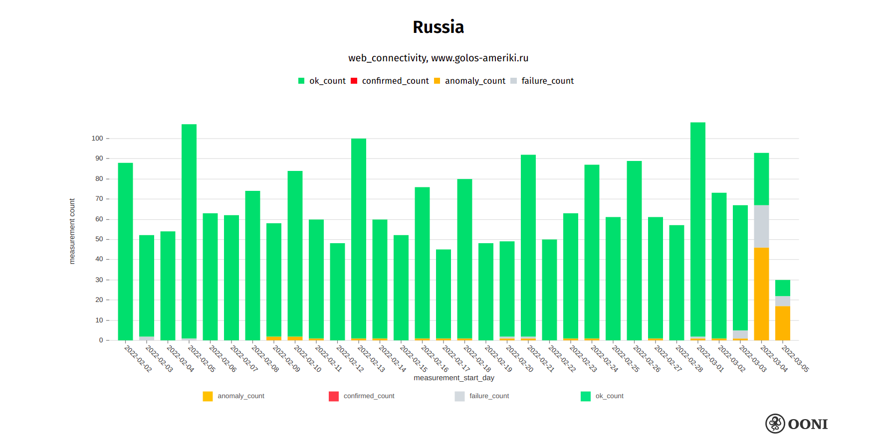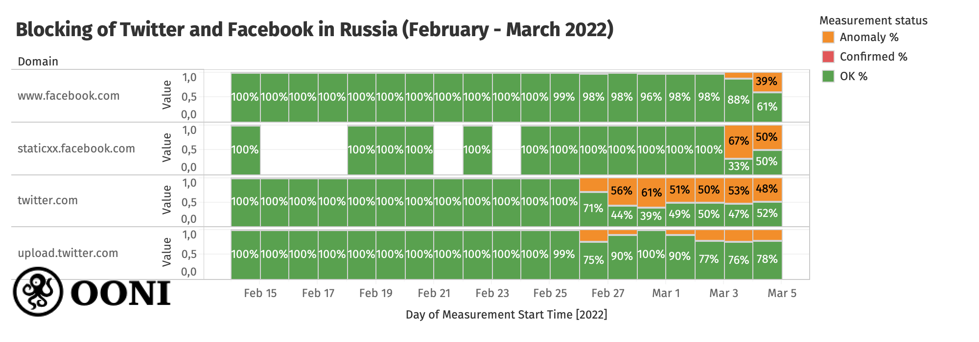 - Blocking of Facebook and Twitter. OONI data shows that access to facebook.com and twitter.com was blocked in Russia by 4th March 2022 (primarily through the injection of RST packets).