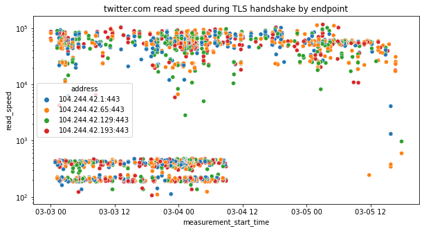 Furthermore, we break down the read_speed metric by destination endpoint to conclude that there doesn’t seem to be any difference in the endpoint being contacted when performing the TLS handshake.