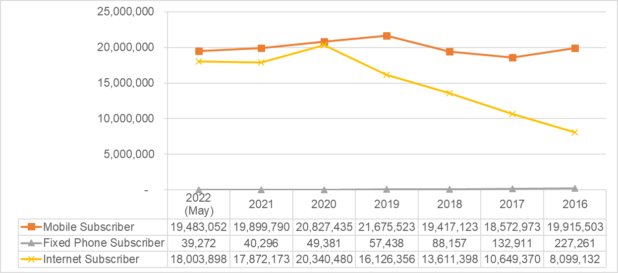 Three prominent communication tools in Cambodia are mobile phone, fixed phone and internet. According to the newly functioning Telecommunication Regulators of Cambodia (TRC), the usage of the fixed phone decreased from 227,261 subscribers in 2016 to 39,272 subscribers in 2022 (May). The usage of mobile phone is moderately stable, just slightly decreased from 19.91 million subscribers in 2016 to 19.48 million in May 2022. However, the internet penetration has increased dramatically in 7 years. It increased from 8.09 millions in 2016 to 18.00 million internet subscribers in May 2022. It is worth noting that one person could subscribe to more than one network.