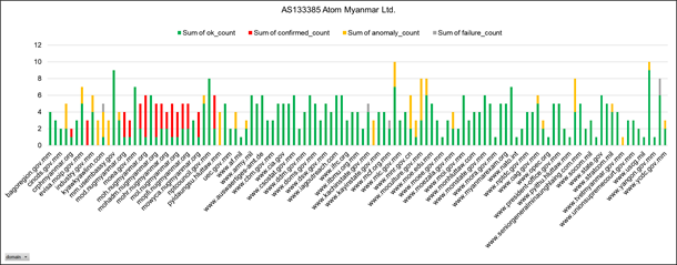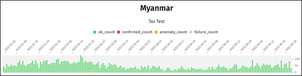 During the first half-year of 2022, 753,018 OONI measurements were collected from 2,130 websites through 37 vantage points in Myanmar. From this total, it was seen that 88.8% (668,881) were OK, 9.9% (74,711) were anomalies, 1.1% (7,953) were failed measurements and 0.2% (1,473) were confirmed blockings.