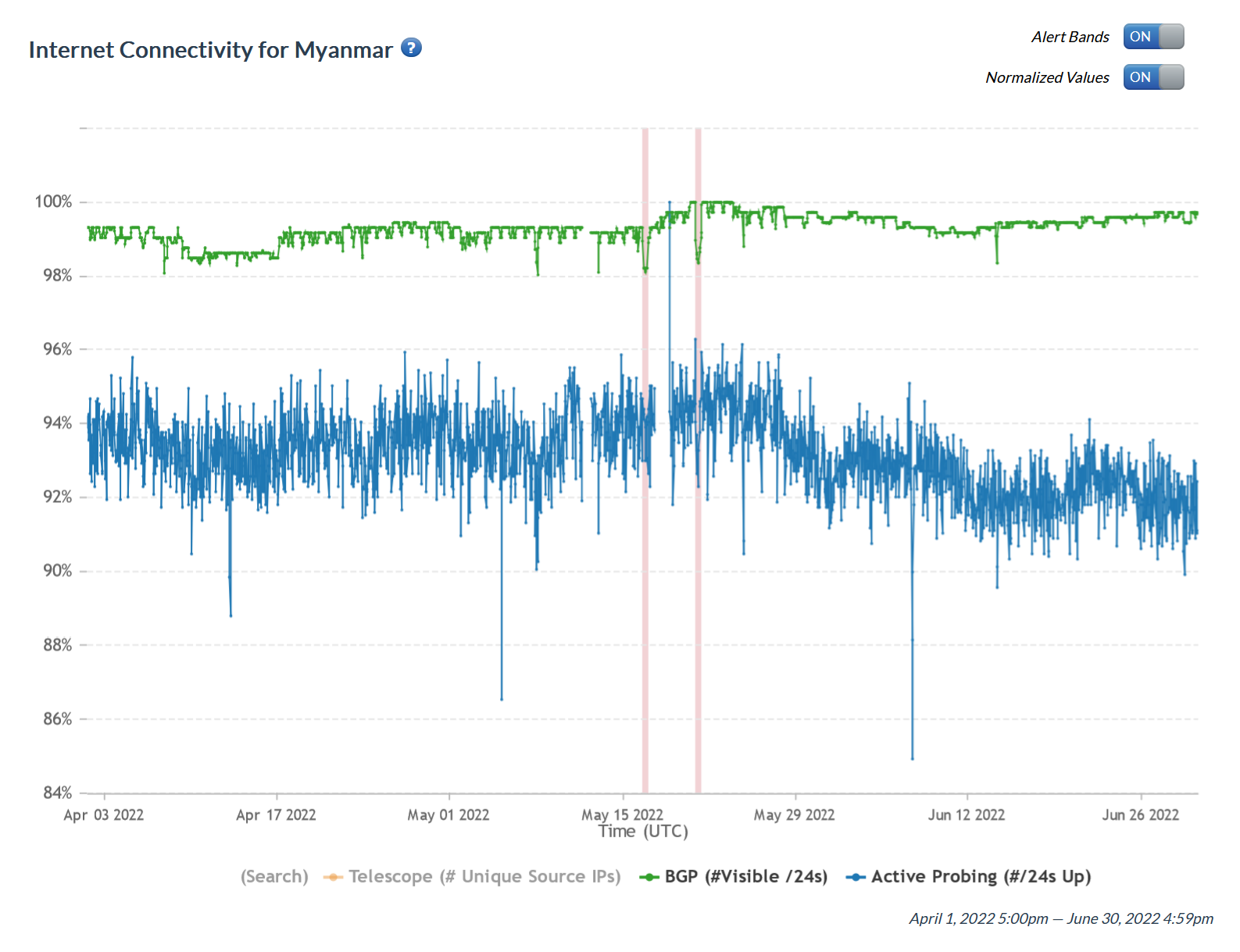 - Sign of internet outages: IODA and Google Traffic data indicate that no major internet connectivity outages have been reported between January 1, 2022, and June 30, 2022. However, on May 16, 2022, and May 20, 2022, there were alerts regarding an Internet disruption and a possible internet outage.