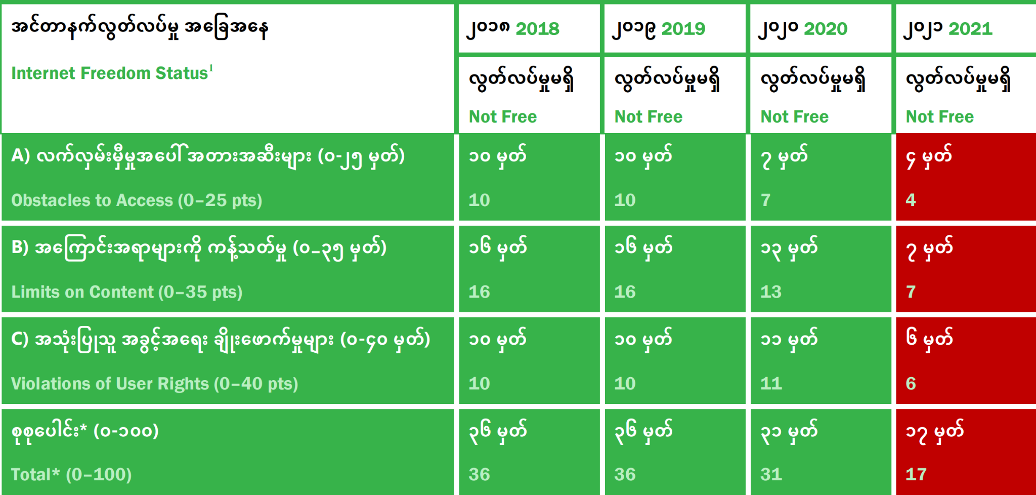 February 1, 2021, marked significant disruptions to the country’s internet connection. Digital access became limited for all in Myanmar, exceptionally impacted were ethnic groups living in conflict-affected zones, including the Rohingya. The military regime banned local ethnic news outlets,38 as well as satellite TV and radio, which are the dominant forms of access to information in rural areas.39 Additionally, Freedom House reported that 2000+ websites have been blocked from February to August 2021, under the Telecommunication Law40 and Myanmar’s low ranking in 2018 with 36 points dropped further to 17 points in 2021 (see Table 1).