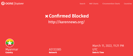 Phyu Phyu Kyaw. Xynou, M. & Filasto, A. (2020, May 6). Myanmar blocks “fake news” websites amid COVID-19 pandemic. OONI. https://ooni.org/post/2020-myanmar-blocks-websites-amid-covid19/ ↩︎