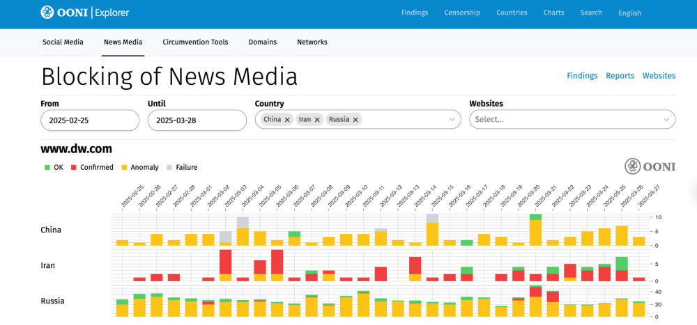 By default, these charts are filtered based on 3 countries: China, Iran, and Russia. We chose those countries because they have stable OONI measurement coverage and high levels of internet censorship, providing an opportunity to present more interesting charts (in comparison to other countries). OONI measurement coverage is available for most countries, and you can adjust the charts in these pages by changing the countries and date range (which is set to the past month by default). To better understand the charts, please refer to our documentation on interpreting OONI data.